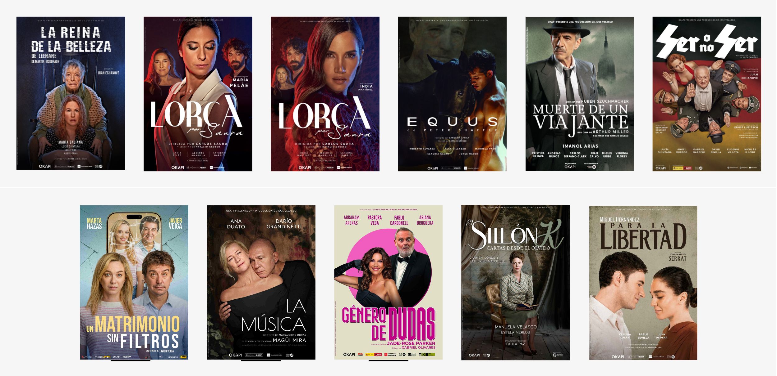 El primer proyecto que sale a la luz bajo Okapi Producciones es en 2018 “El Coronel no tiene quien le escriba”, dirigida por Carlos Saura y protagonizada por Imanol Arias. Tras la exitosa adaptación de Natalio Grueso, del texto de Gabriel García Márquez, Okapi continúa con su segunda producción teatral: “La fiesta del Chivo” de Mario Vargas Llosa, también adaptada por Natalio y de nuevo dirigida por Carlos Saura y esta vez protagonizada por Juan Echanove.
